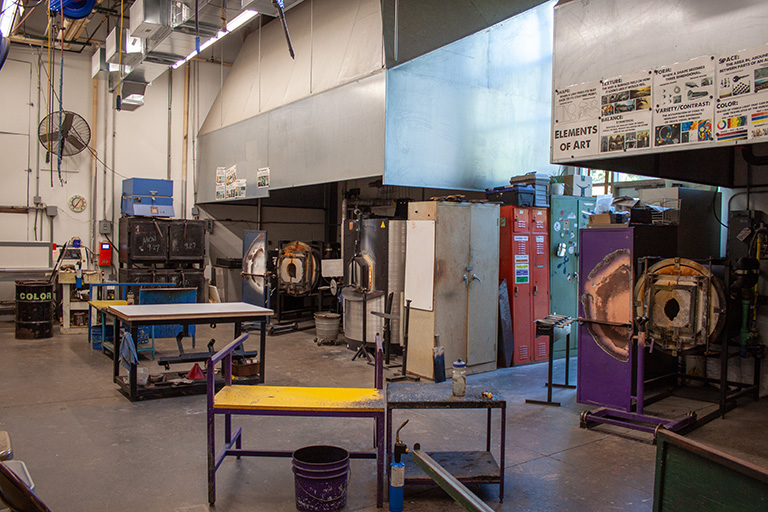 Join us in our state-of-the-art hot shop with a 400# furnace, 3 gloryholes, 4 annealers, and 2 fusing kilns. Each bench is supplied with propane hookups and compressed air. For flameworking, we have a setup for 6 workstations equipped with GTT Bobcat torches and a variety of hand tools. Also available is an integrated cold shop with a 24” lap wheel, vertical belt sander, and full-service stained glass studio. Join us and experience all that glass has to offer!