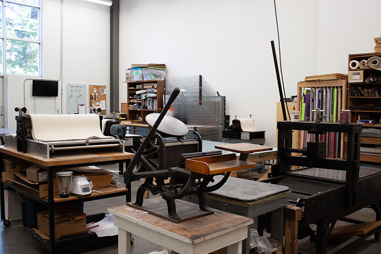 Our print shop has a variety of presses to make your printing dreams come to life. Jump into lithography, etching, screenprinting, wood block, and letterpress; even book arts and papermaking! Our printmaking community includes beginners, seasoned printers, and talented instructors. Join our print shop to make multiple prints from a single plate, block, or screen as you explore the many inks and tools included in your class registration!