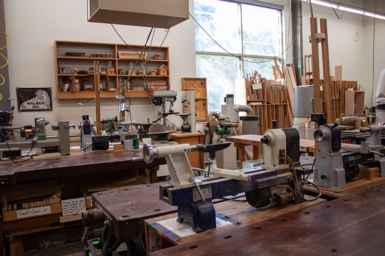 Join us in our state-of-the-art wood shop with 2 SawStop table saws, 2 band saws, a miter saw, a 6” jointer, a 15” planer; as well as 3 full-size and 3 midi lathes. The studio also has a multitude of power and traditional hand tools available. Dust collection is fixed to most equipment for your safety. Come experience the joy of working with your hands in this safe and supportive studio environment!