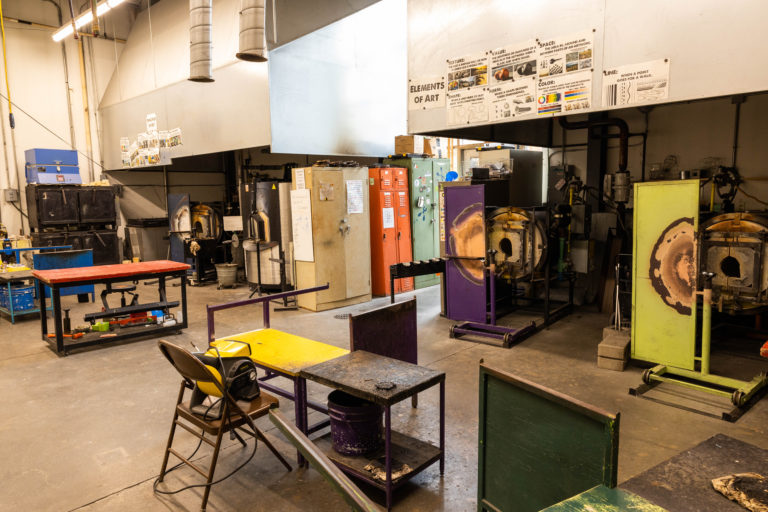 Join us in our state-of-the-art hot shop with a 400# furnace, 3 gloryholes, 4 annealers, and 2 fusing kilns. Each bench is supplied with propane hookups and compressed air. For flameworking, we have a setup for 6 workstations equipped with GTT Bobcat torches and a variety of hand tools. Also available is an integrated cold shop with a 24” lap wheel, vertical belt sander, and full-service stained glass studio. Join us and experience all that glass has to offer!