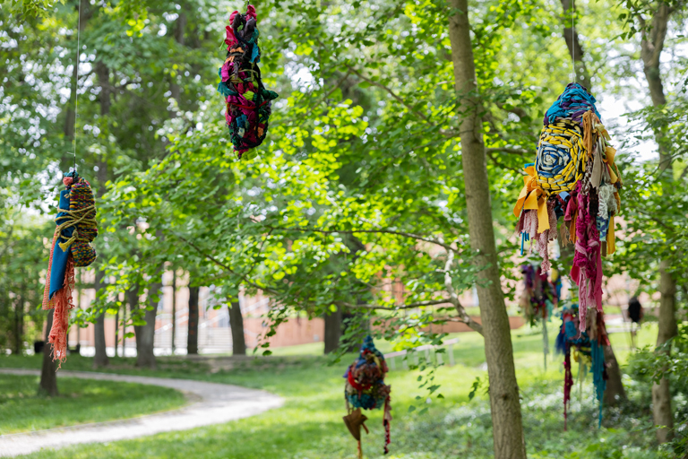 Plotting for Y is a temporary, outdoor exhibition at the Indy Art Center’s ARTSPARK by visual and teaching artist, Gina Lee Robbins. Robbins activates the Michael Graves-designed park with sculptures comprised of fibers and various found materials. These sculptures strike a compelling balance of alien but familiar qualities as if to encourage viewers to relentlessly investigate their surroundings. Viewers are invited to explore the textures and origins of these sculptures while meandering the varied terrain of ARTSPARK.